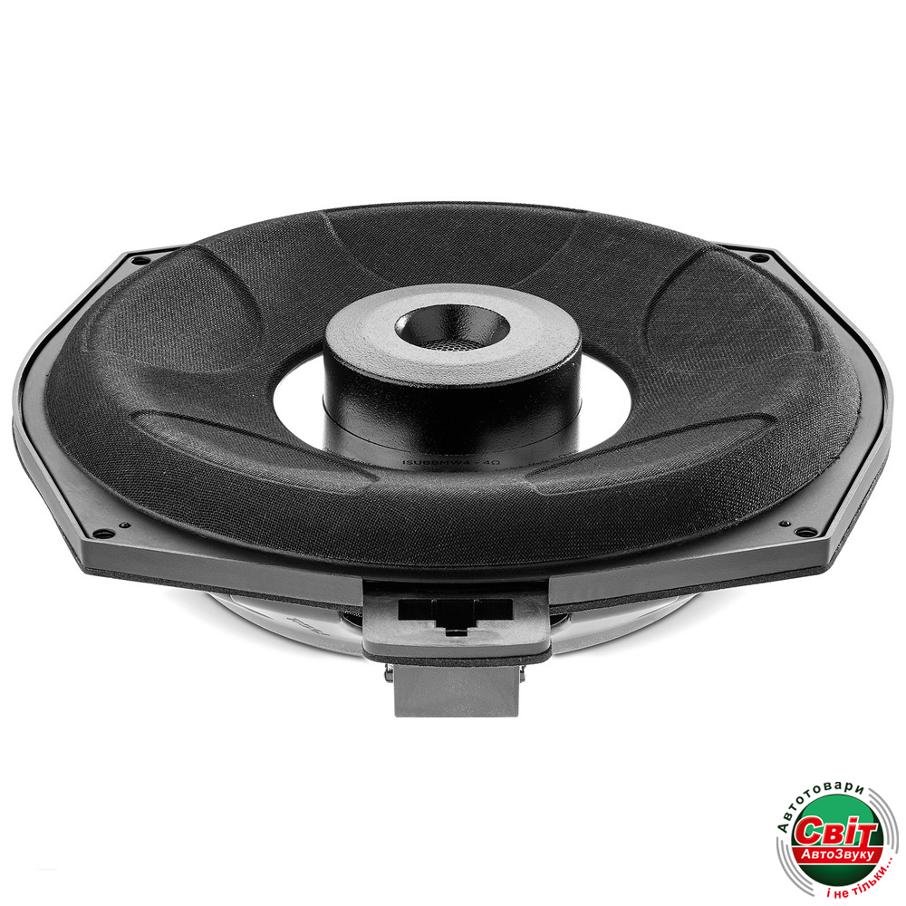 Сабвуфер Focal ISUB BMW 4Пасивний мідбас сабвуфер типорозміру 8 дюймів, призначений для використання в автомобілях BMW і Mini для установки під переднє водійське або пасажирське сидіння. FOCAL ISUB BMW 2 зроблено з використанням потужного неодимового магніту і особливого композитного дифузора, встановлених на литий алюмінієвий кошик, що в сукупності забезпечує максимально ефективне відтворення низьких частот без сторонніх звуків у всьому діапазоні гучності. Відрізняється дуже високою швидкістю і простотою установки, а також комплектується всіма необхідними монтажними аксесуарами. Номінальна потужність сабвуферного динаміка дорівнює 90 Вт за RMS, максимальна - 180 Вт RMS, чутливість 86 дБ і опір 4 Ом, що необхідно враховувати під час узгодження динаміка з підсилювачем звуку.