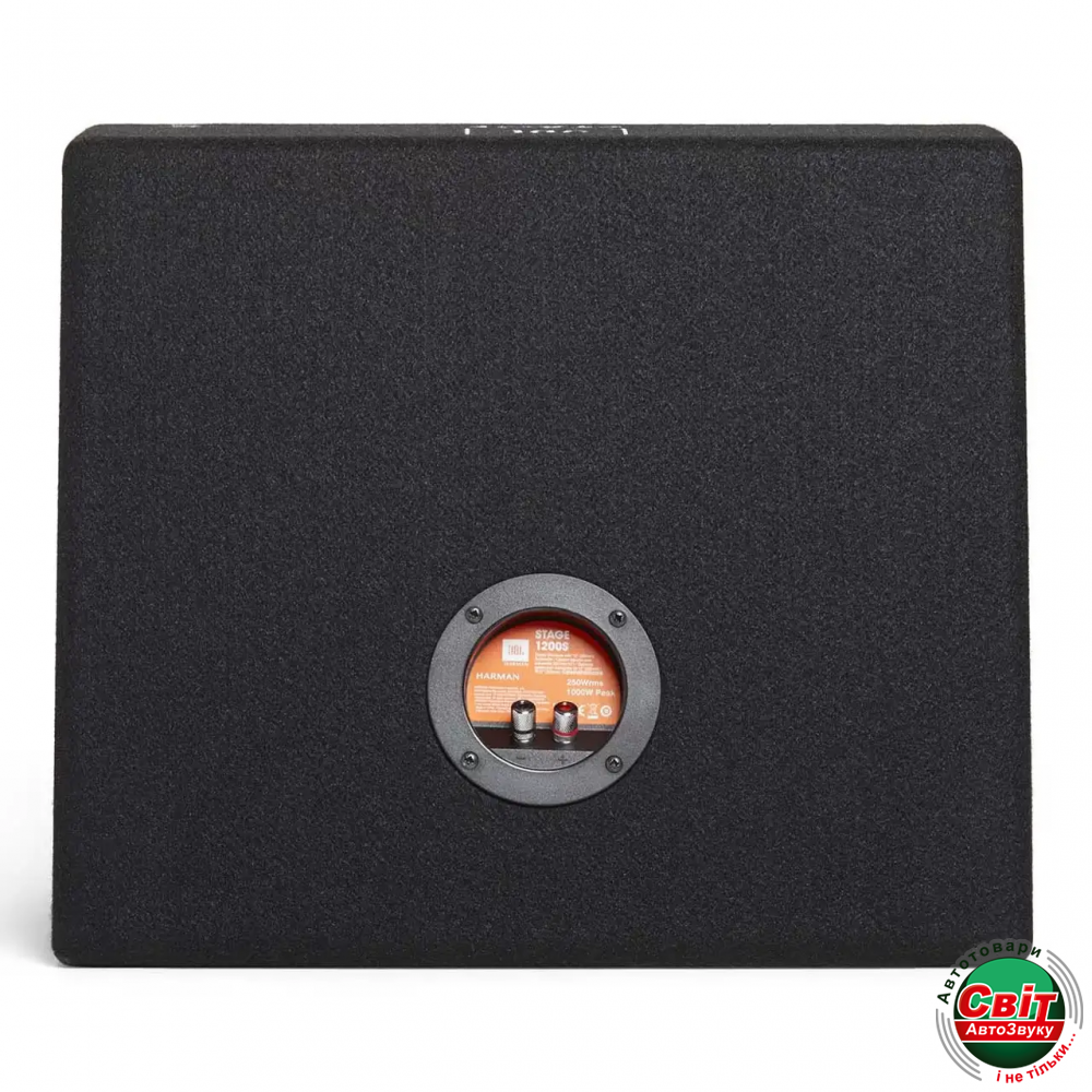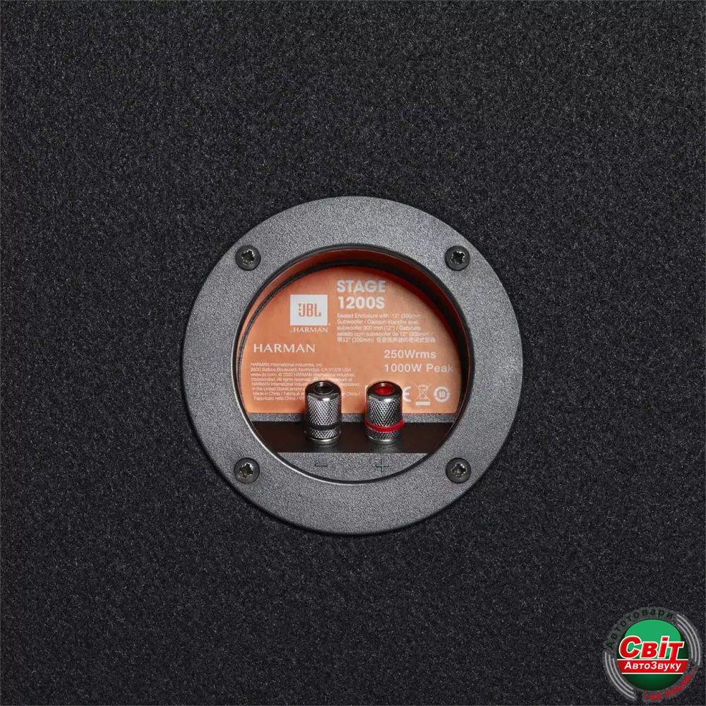 Сабвуфер JBL Stage 1200SSTAGE 1200S - це пасивний корпусний сабвуфер від бренду JBL. Розмір динаміка 12 дюймів (30 см.). Динамік має легку рухому систему і м'які підвіси, що дає високу чутливість. Звукова котушка з імпендансом 2 Ом. Має один фазоінверторний порт - це вивід у вигляді налаштованої труби, з яких виходить повітря, тим самим випромінюючи звук від задньої частини дифузора. Чутливість: 91 дБ. Підключення здійснюється за допомогою лінійних RCA-входів або високорівневого входу.