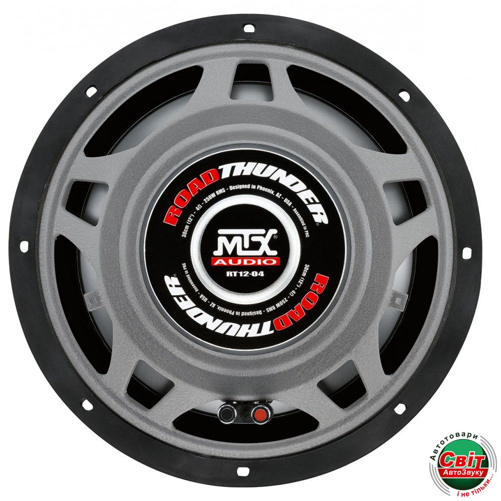 Сабвуфер MTX RT12-04Сабвуферний динамік MTX RT12-04 з одинарною звуковою котушкою 30 см (12 дюймів) потужністю 250 Вт RMS 4 Ом володіє всіма характеристиками: довгий хід, гумова підвіска, поліпропіленовий дифузор з тисненим логотипом MTX, велика магнітна конструкція дюйми), SPV технологія охолодження, технологія ALDS і т. д. Враховуючи ціну, це подвиг.