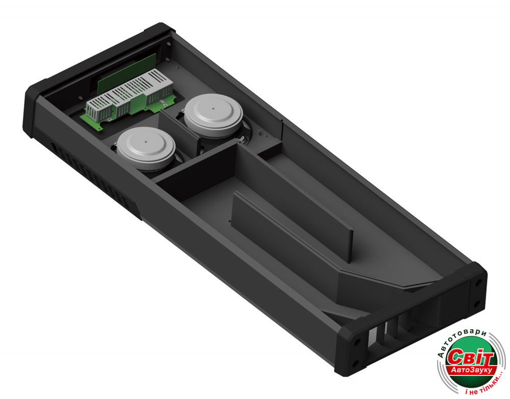 Толщина корпуса - всего 97 мм! Сам корпус - очень прочный, выдерживает большой вес, так что на него можно ставить тяжелый багаж, это никак не повлияет на работоспособность сабвуфера. Идеальное решение для практичных автолюбителей, не желающих терять полезное пространство багажника