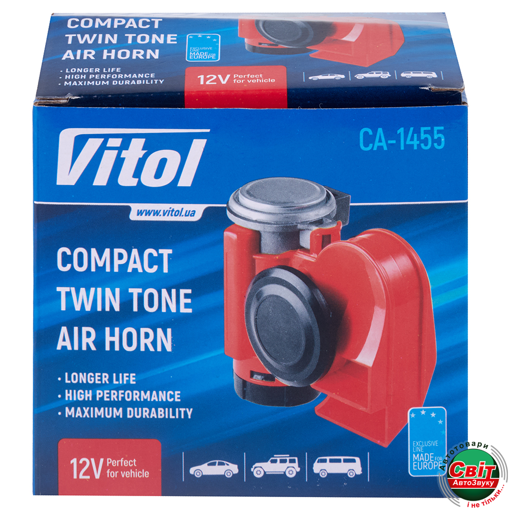 Сигнал пневматичний Vitol CA-1455 червонийCA-1455 від VITOL — це компактний, але потужний пневматичний сигнал, який чудово підходить для легкових авто, мотоциклів, квадроциклів та позашляховиків. Завдяки вбудованому компресору і подвійному тону, пристрій забезпечує гучне й чітке звучання в потоці транспорту.