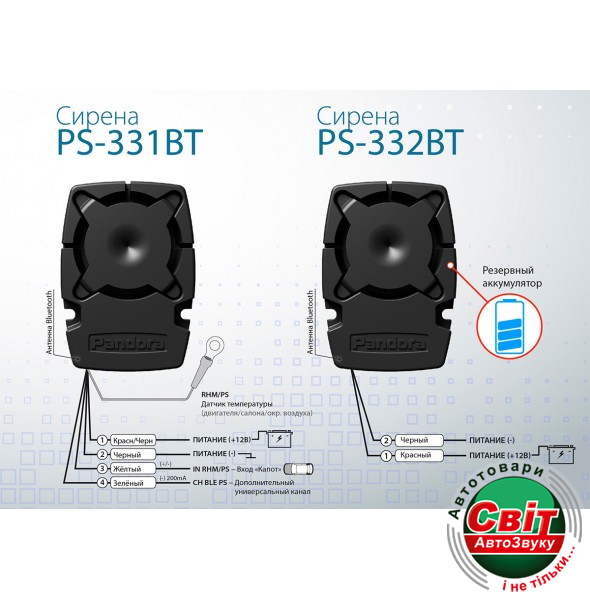 Сирена Pandora PS-332BT (п'єзоелектрична)Сирена підключається до будь автосигналізації Pandora/Pandect з Bluetooth-інтерфейсом, звільняючи для творчості майстра-установника двухамперный плюсовій канал базового блоку системи, що призначається для підключення дротової сирени. Вбудований літієвий акумулятор з розширеним температурним діапазоном експлуатації і вбудованою комплексної електронної захистом забезпечує відповідність вимогам, що пред'являються до автономності засобів сповіщення (за часом автономної роботи і рівнем гучності).