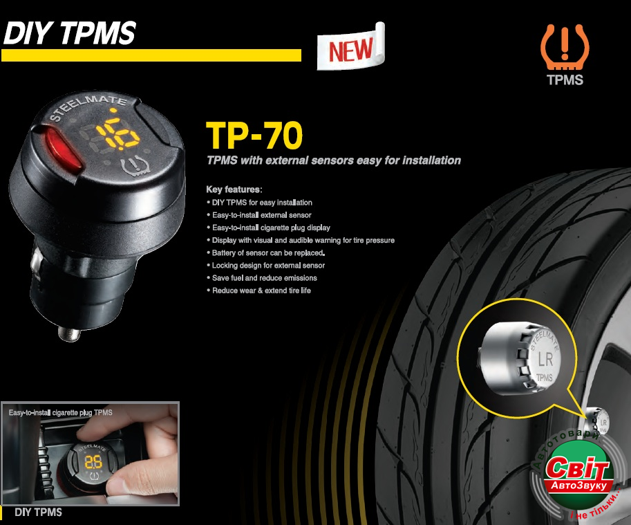 Система мониторинга давления и температуры в шинах SteelMate SM DIY TP-70Назначение системы: