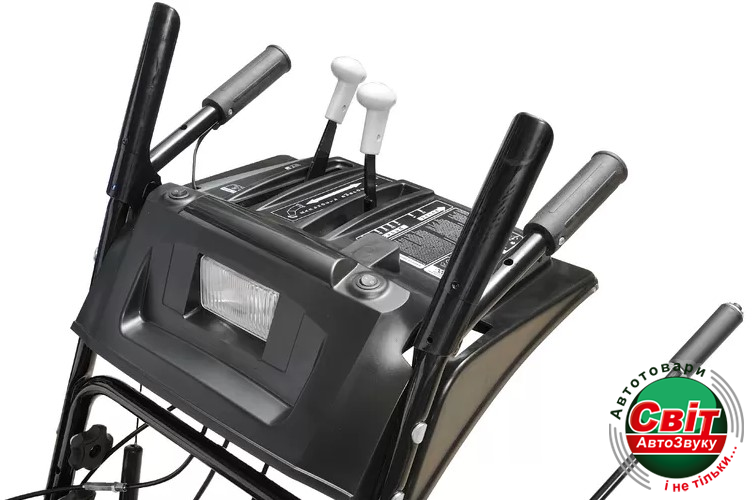 Сильная галогенная фара находится в верхней точке снегоуборщика, откуда может наиболее полно охватить обрабатываемую территорию. Полезное устройство для активной работы оператора, учитывая, что продолжительность светового дня зимой, значительно снижена. Направленный поток светового луча светильника хорошо освещает рабочую зону в сумерки и даже при небольшом снегопаде. Кнопка включения находится на панели оператора.