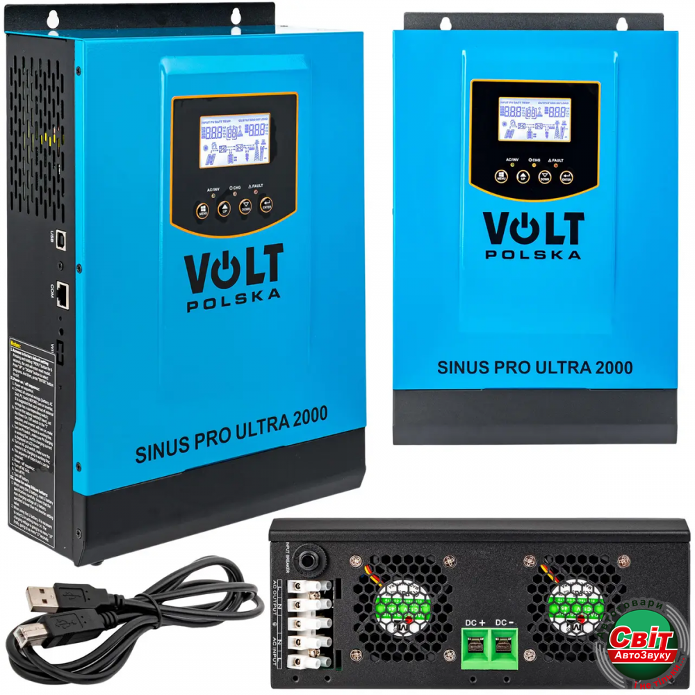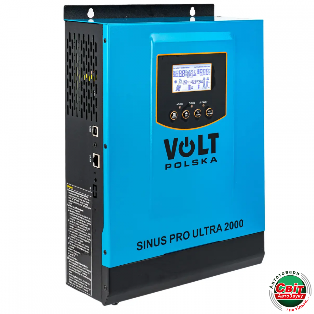 Сонячний інвертор Volt Polska SINUS PRO ULTRA 2000 12/230V (1000/2000W)Сонячний інвертор SINUS PRO ULTRA 2000 є пристроєм, який поєднує в собі кілька функцій: інвертор, сонячний зарядний пристрій і зарядний пристрій для акумуляторів. Чіткий РК-дисплей забезпечує просте та інтуїтивно зрозуміле керування за допомогою кнопок для таких налаштувань, як: струм заряджання акумулятора, пріоритет зарядного пристрою змінного струму/сонячної батареї, допустима вхідна напруга залежно від різних застосувань.