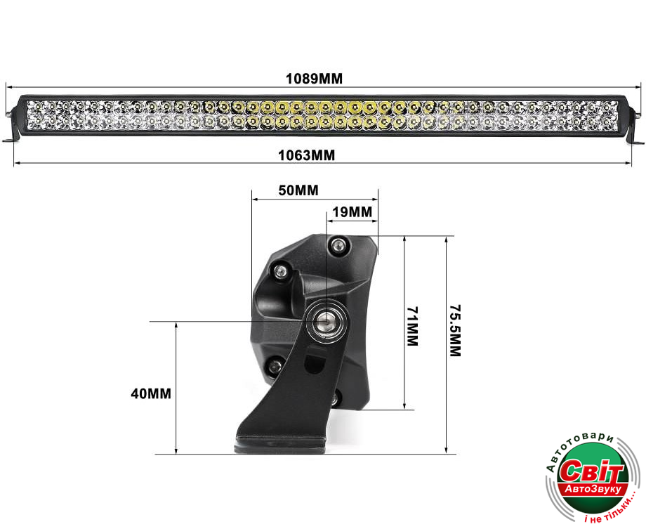 - Размеры мм: 1063 x 71 x 50. С креплением: 1089 x 76 x 50