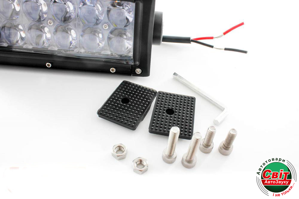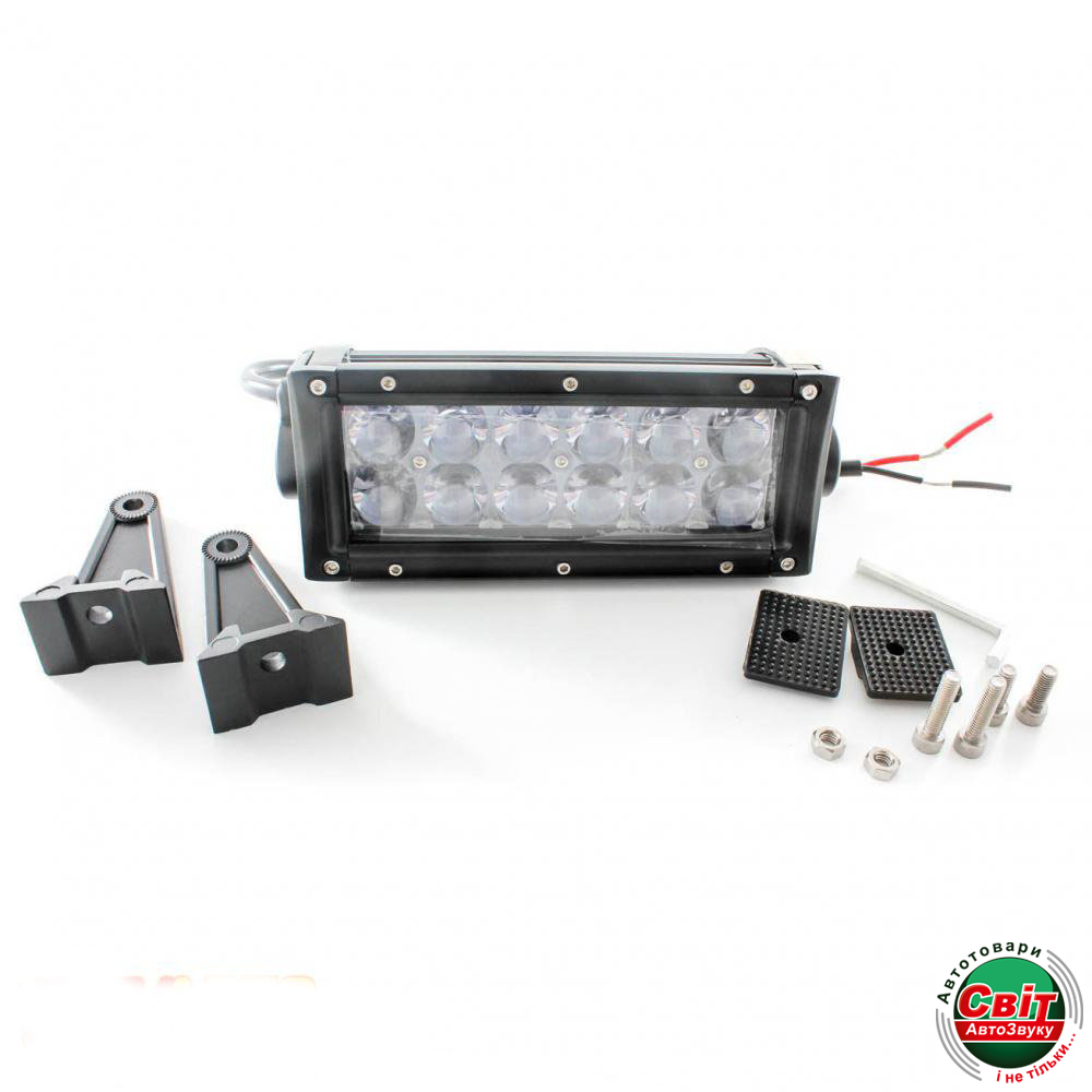 В данной модели 12 диодов, компании CREE, высокой интенсивности, которые размещены в две линии. Мощность одного диода 3 Вт, что в сумме дает потребляемую мощность фары в 36 Вт, а световой поток 3 360 Лм. Луч рассеянный с углом рассеивания 90°. Свет белый яркий, с цветовой температурой 6000 К, что дает голубой оттенок. Широкий диапазон рабочих напряжений от 10 В до 30 В. Светодиоды находятся под линзами, которые изготовлены из закаленного стекла.