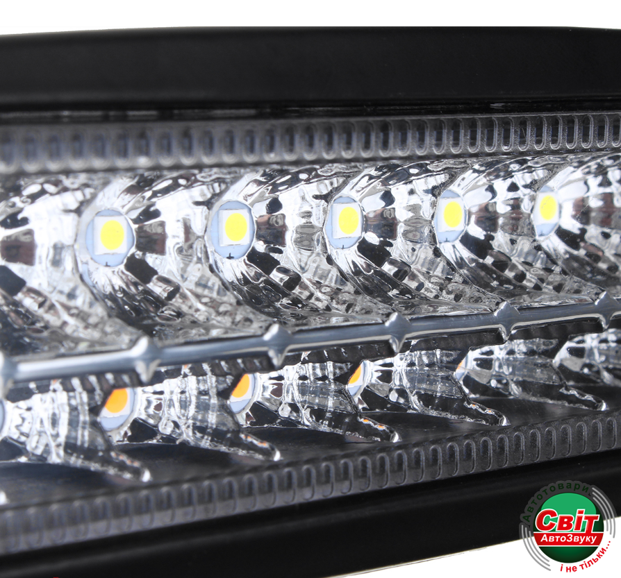 В данной модели 18 диодов Epistar, высокой интенсивности. Мощность потребления одного диода 2 Вт, в суме дает мощность фары 36 Вт, а сила светового потока 2600 Лм. Свет белый яркий, с цветовой температурой 6000 К, +повторитель поворота желтый с цветовой температурой 3500 К .Тип луча - рассеянный. Широкий диапазон рабочих напряжений от 10 В до 24 В постоянного тока. Корпус, изготовлен из литого алюминия, черного цвета, с прочным стальным монтажным кронштейном, который выдерживает эксплуатацию даже в экстремальных условиях. Линзы изготовлены из поликарбоната, который устойчивый к нагреванию, его температура плавления 140°, и механическим деформациям. Класс защиты фары на уровне IP67, что означает полное не проникновения пыли и способность выдерживать погружение в воду менее одного метра. Может полноценно работать при температуре от -40°C до 85°C. Длительный срок службы диодов, более 30000 часов.