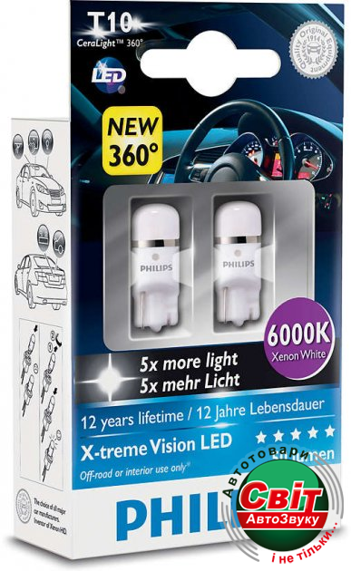Світлодіодна лампа Philips T10 X-tremeVision LED 6000K (127996000KX2) (2pcs blister)Автомобільні світлодіодні лампи Philips серії X-tremeVision LED забезпечують максимальну комфортну яскравість світіння і високу довговічність. Дана модель забезпечує з ефектом світіння білого ксенону - колірна температура 6000 К. Стильні світлодіодні лампи Philips з променем 360 забезпечують максимальну безпеку і стильний вигляд завдяки рівномірному розподілу світла і високому рівню яскравості.
