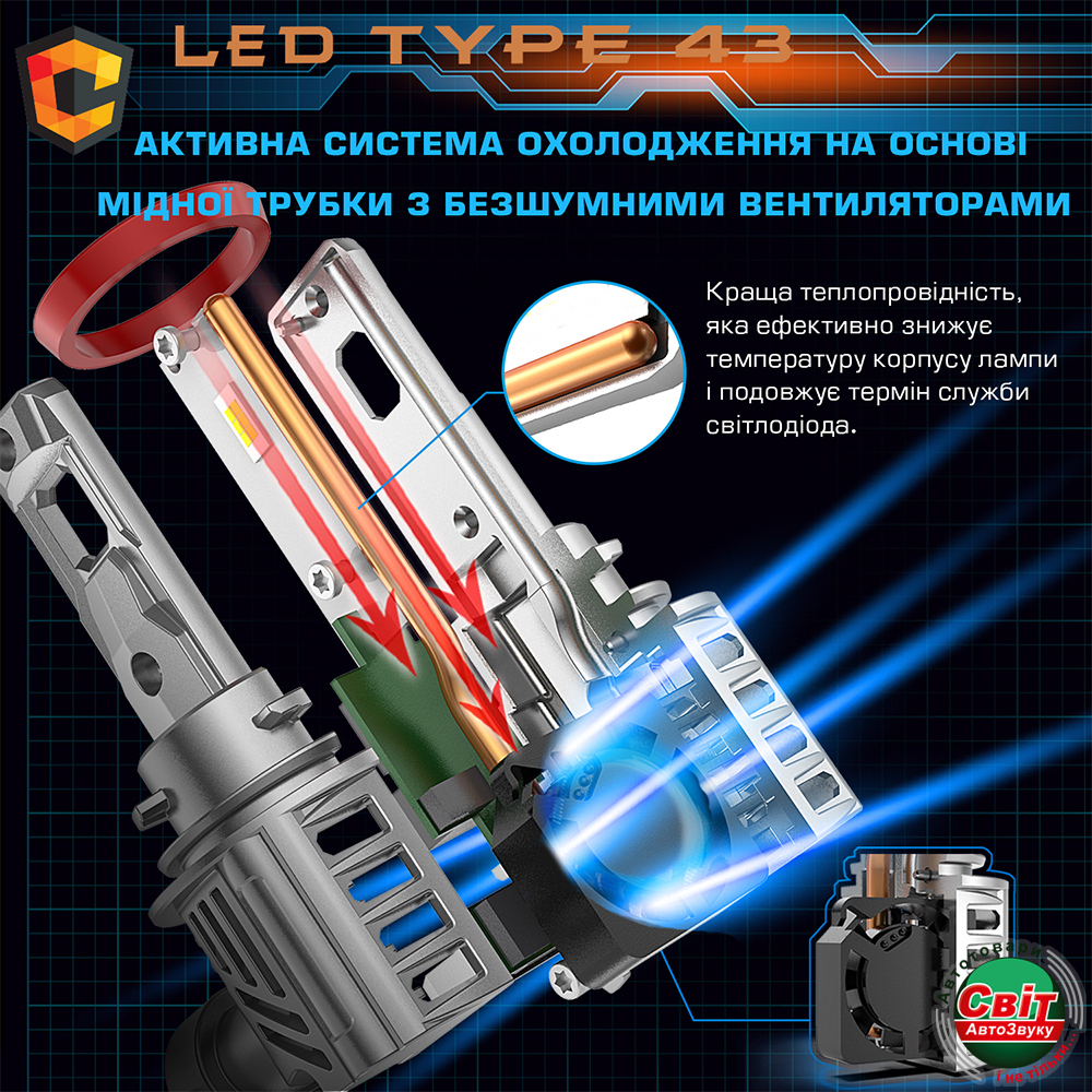 Радіатор з авіаційного алюмінію з великою площею ідеально відводить тепло від лампи, що дозволяє використовувати світлодіоди на повну потужність. При цьому ні сама лампа, ні штатна оптика автомобіля не перегріваються.