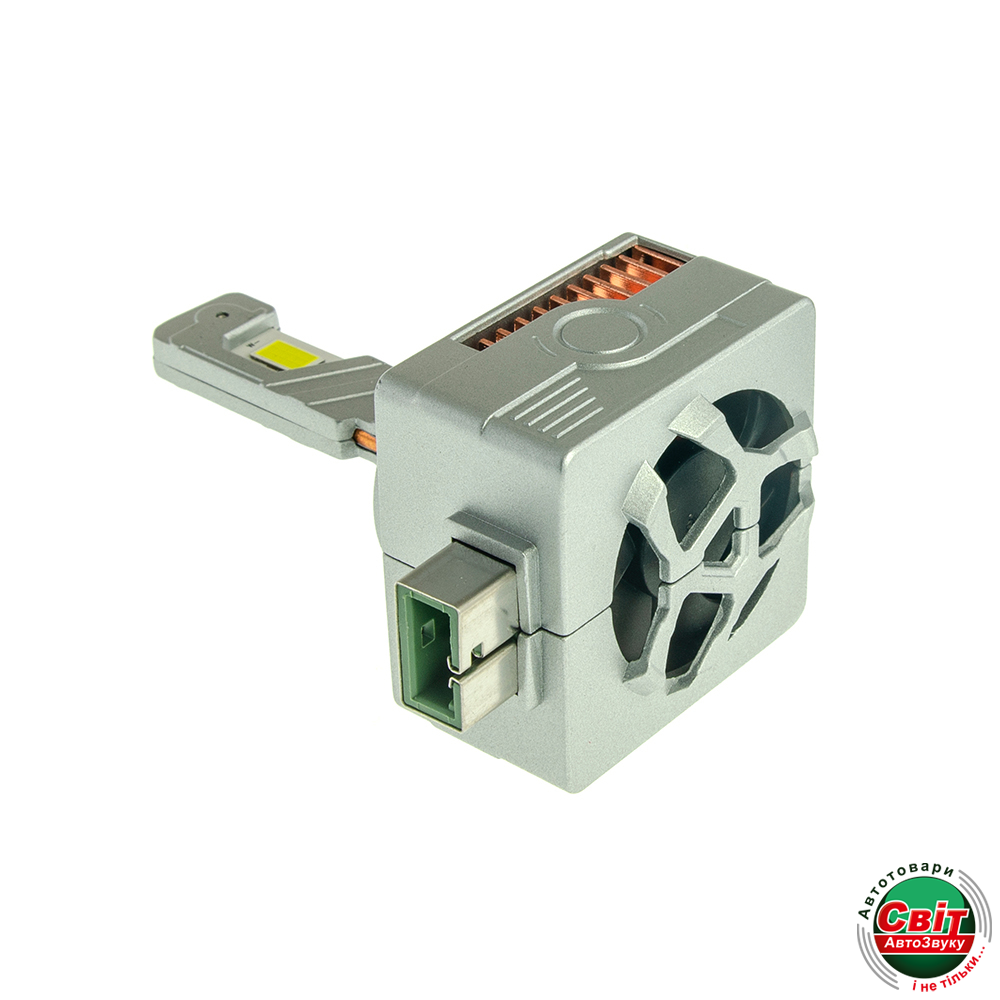 Радіатор з авіаційного алюмінію з великою площею та вбудований кулер ідеально відводить тепло від лампи, що дозволяє використовувати світлодіоди на повну потужність. При цьому ні лампа, ні штатна оптика автомобіля не перегріваються.
