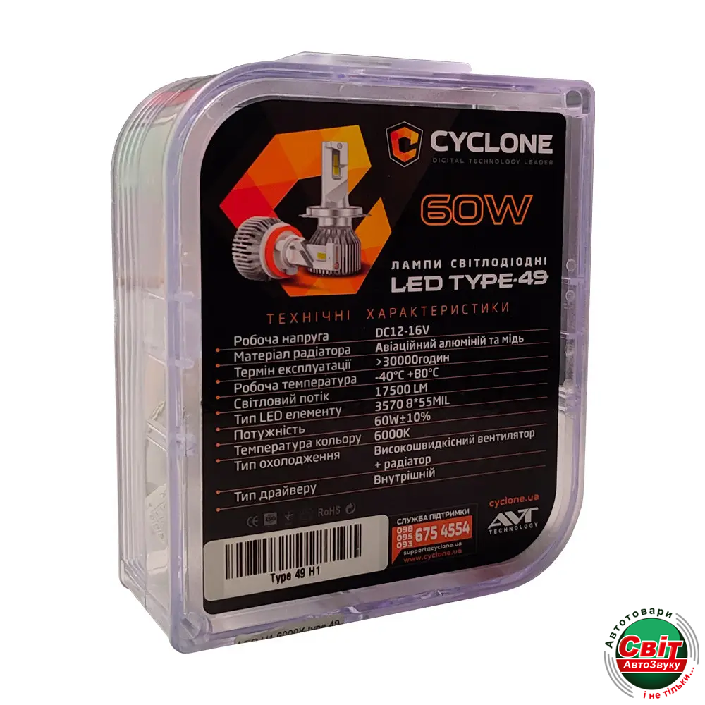 Світлодіодні лампи Cyclone LED H3 6000K type 49 (пара)Інтелектуальна система охолодження з використанням мідної теплової трубки збільшеного діаметра, застосування високошвидкісного вентилятора дозволили досягти максимальної світловіддачі чіпів 3570 8*55MIL. Зовнішній драйвер застосований у цих лампах виконаний на новій елементній основі, із застосуванням лише якісних елементів. Кожна лампа проходить повний цикл перевірок, що дозволяє впевнено гарантувати стабільну роботу протягом усього рядка служби.