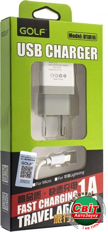 - ›МЗП GOLF GF-U1 Travel charger + Lightning cable 1USB 1A White
