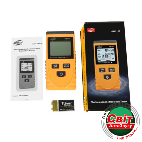 Тестер електромагнітного випромінювання Benetech GM3120Измеритель излучения GM3120 может тестировать излучение электрического поля и излучение магнитного поля. Он используется для тестирования и изучения ситуации с электромагнитным излучением в помещении и на улице. Прибор оснащен встроенным датчиком электромагнитного излучения, который может отображать значение излучения на цифровом ЖК-дисплее. Вы можете сделать разумную обработку или принять эффективные меры защиты от электромагнитного излучения в соответствии с результатами теста. Верхний показатель на ЖК дисплее это электрическое поле (низкочастотные излучения), измеряется в V/м, максимальные показания: 1999V/м. Нижний показатель электромагнитное поле (высокочастотное излучение), измеряется в W/cm#178;. Такое излучение способны выдавать мобильные телефоны, компьютеры, телевизоры и т.д. Максимальные показания 19,99#956;W/cm#178;.