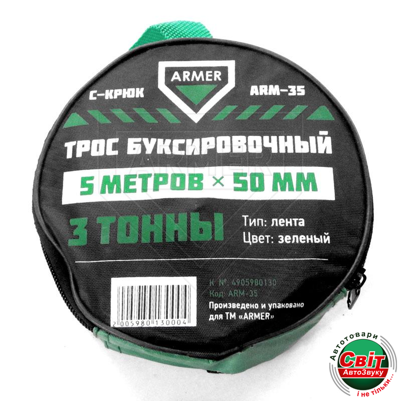 - ›Трос буксирувальний ARMER ARM-35 (3т. стрічка 5м. С крюк, зелений)