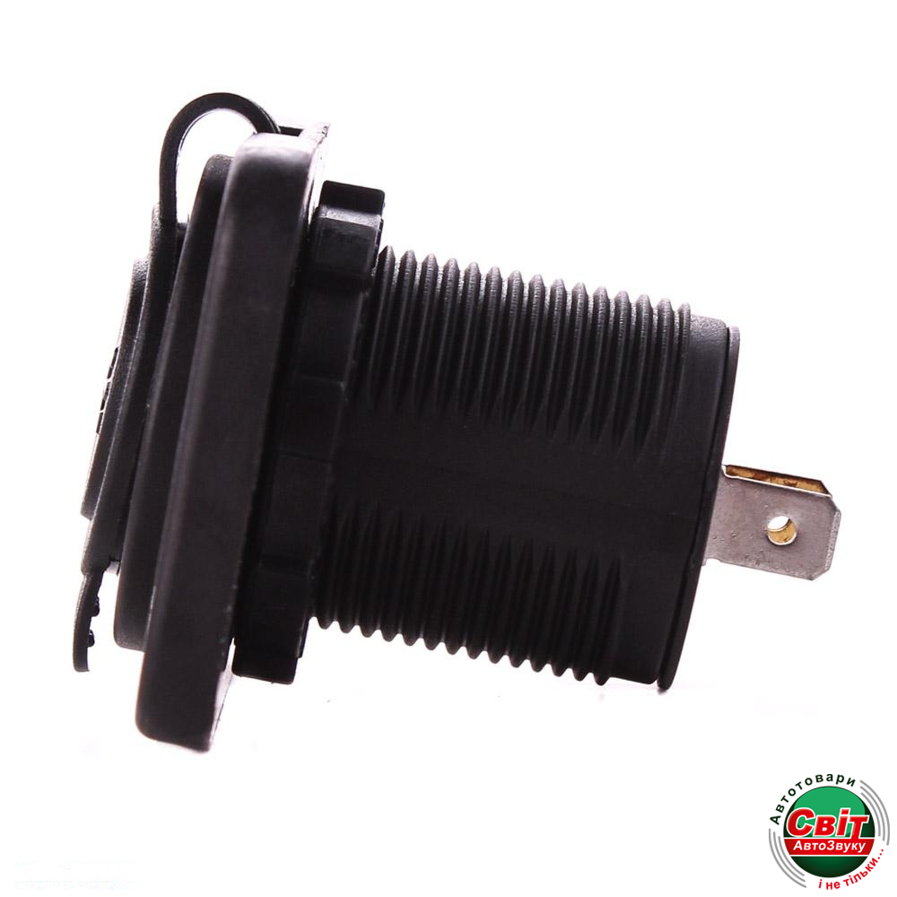 Зарядное устройство черного цвета, материал - пластик. Монтажная глубина и диаметр составляют 29 и 37 мм. Входящее напряжение равняется 12 В, а напряжение USB - 5 В.