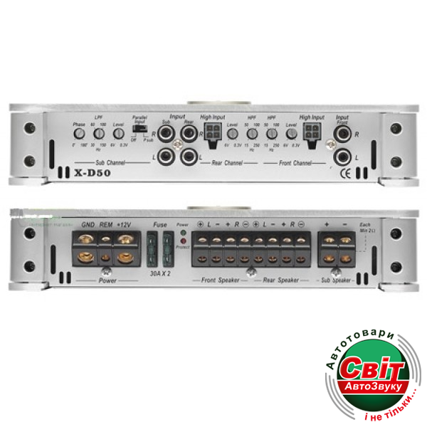 Пятиканальный автомобильный усилитель. Серия "X-Program". Класс усилителя: D. Максимальная выходная мощность (2 Ом): 4х130 + 1х310 Вт. Номинальная выходная мощность RMS (4 Ом): 4x80 + 1х270 Вт. Диапазон частот: 10 - 35000 Гц. Отношение сигнал / шум: > 100 дБ. Возможность мостового включения нагрузки. Габаритный размер: 399x250x50 мм. Цвет - cеребристый.