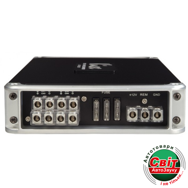 Четырехканальный автоусилитель. Выходная номинальная мощность на 4 Ом: 100Вт x 4, выходная номинальная/максимальная мощность на 2 Ом: 200Вт/360Вт x 4, выходная мощность в мостовом включении на 4 Ом: 200Вт x 2. Частотный диапазон 20-20000 Гц. Отношение сигнал/шум: >90дБ. В комплекте проводной пульт ДУ регулировки уровня баса и громкости (0-18дБ / 60Гц)