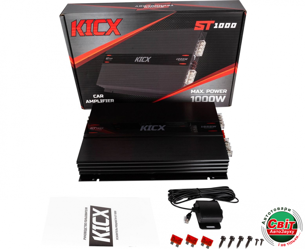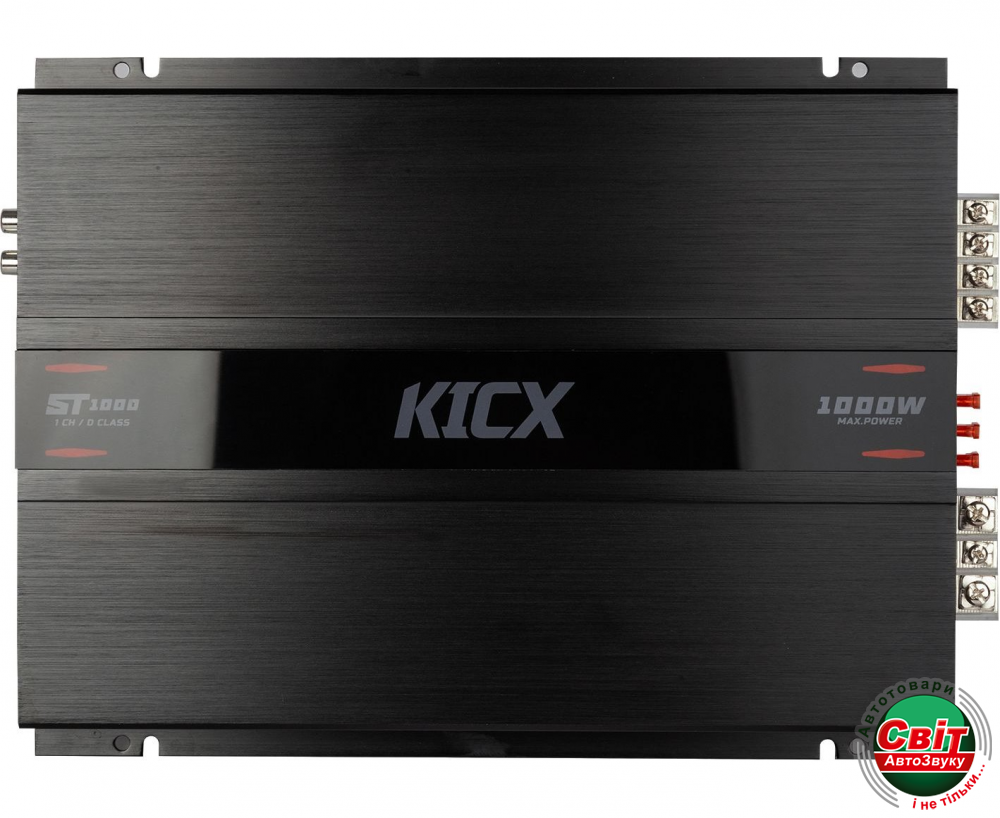 Підсилювач Kicx ST 1000Автомобільний підсилювач Kicx ST 1000 спеціально створений для роботи з сабвуфером і володіє повним набором регулювань, необхідних для налаштувань сабвуферного ланки. Підсилювач здатний видавати 1000Вт при роботі з 1 Ом навантаженням.