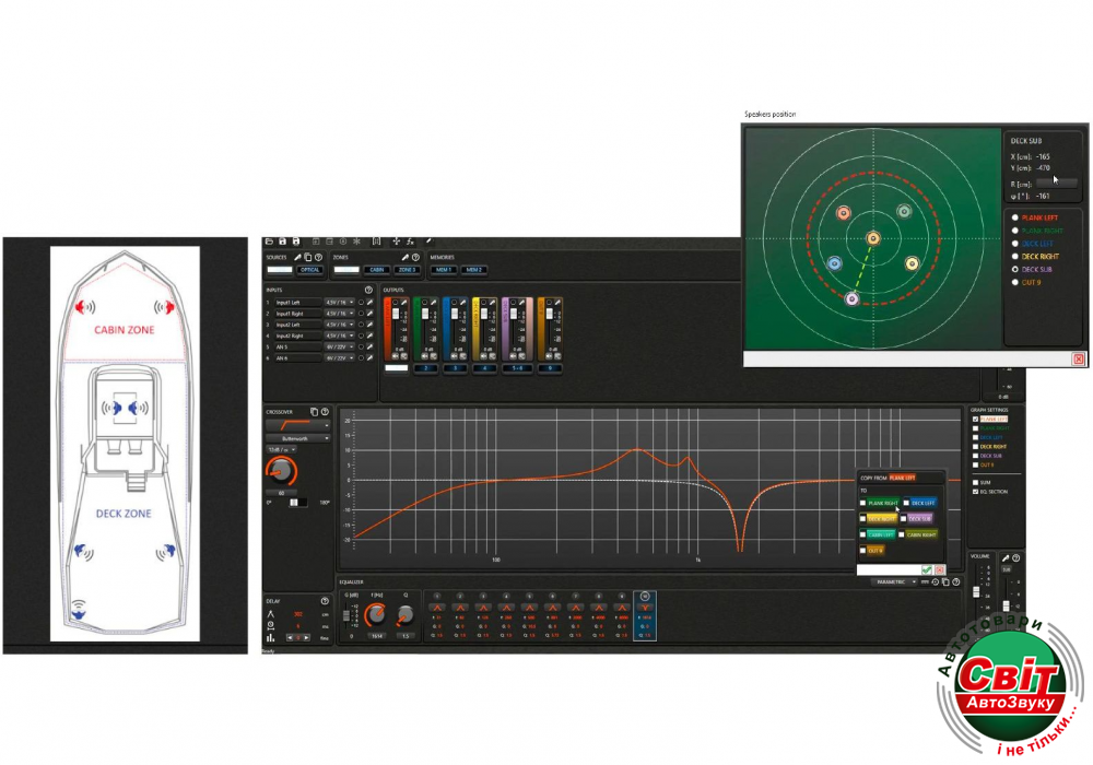 - Програмне забезпечення Hertz Navigator дозволяє створювати конфігураційні установки для будь-яких моделей суден і точок розташування гучномовців, домагаючись видатних результатів в гранично короткі терміни.