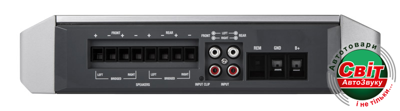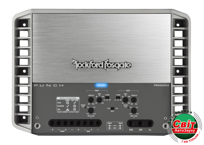Підсилювач морський Rockford Fosgate Punch Marine PM400X4 400 Вт 4-канальний підсилювач з високою динамічної потужності, клас A/B, призначений для мотоспорту і морського застосування. Характеристики:Кількість каналів: 4 Клас: A/BПотужність RMS: 50 Вт x 4 (4 Ом) 100 Вт x 4 (2 Ом) 200 Вт x 2 (4 Ом) мостове Потужність макс.: 82 Вт x 4 (4 Ом) 137 Вт x 4 (2 Ом) 266 Вт х 2 (4 Ом) мостовеЧастотний діапазон: 20-20000 Гц +/- 1.0 дБВхідна чутливість: 150 мВ - 12В Входи: високий/низький рівень: 2 RCA париРекомендований номінал запобіжника: 60 А (не входить в комплект) Тип радіатора: литий алюмінієвий Тип охолодження: конвекція Захист від короткого замикання/перевищення струму/перевищення температури Спеціальне епоксидне покриття плат класу Marine Візуальна індикація: живлення/захист/температура Габаритні розміри (Д х Ш х В): 6.05 x 19.71 x 28.02 (cm)Характеристики