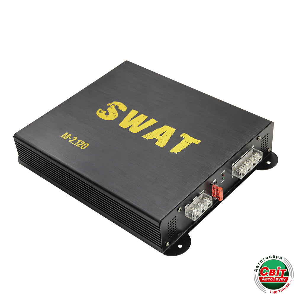 Підсилювач SWAT M-2.120Двоканальний підсилювач використовується в аудіо систему автомобіля для двох динаміків або для сабвуфера за допомогою мостового підключення.