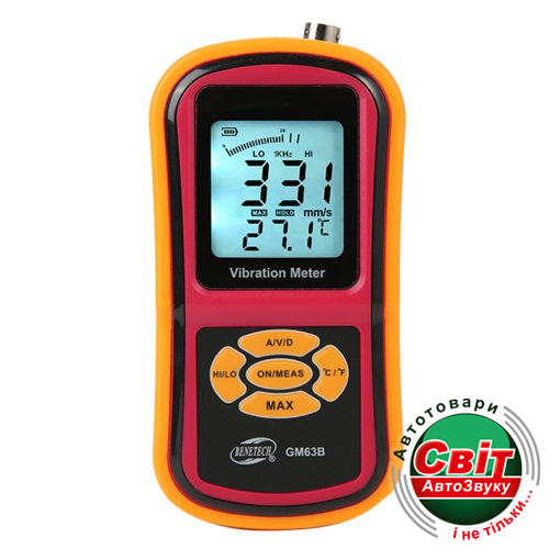 GM63B вибромер производства компании Benetech. Предназначением данного вибромера является измерения параметров скорости, ускорения и смещения. Особенностью GM63B является пробник с кнопкой управления для измерения уровня вибрации в труднодоступных местах, двух диапазонов измерения HI (от 10 Гц до 1 кГц), LO (от 1 кГц до 15 кГц) и пьезоэлектрического керамического акселерометра. Также стоит отметить компактные габариты и эргономичное исполнение вибромера и яркую подсветку ЖКИ дисплея. Расширенная функциональность данного вибромера заключается в функциях отображения максимального значения измерения, функции измерения температуры, удерживания и округления результатов измерения на дисплее.