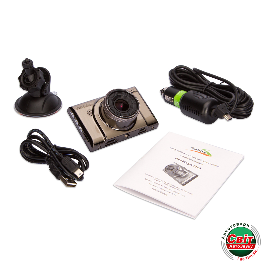 | Комплектация | Відеореєстратор Aspiring AT160 Зарядное устройство для авто USB - кабель Крепление на стекло Инструкция Гарантийный талон |