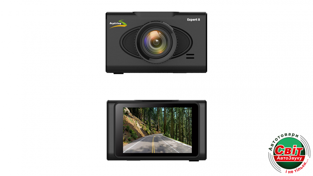 - Комплектація: Відеореєстратор Aspiring Expert 8, зарядний пристрій для авто, кріплення-присоска на лобове скло з роз'ємом підключення живлення до кріплення і вбудованим неодимовим магнітом для утримання реєстратора, додаткова камера FHD, інструкція