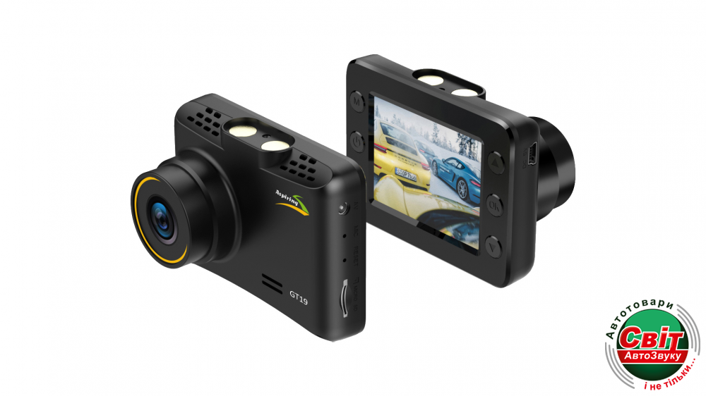 Відеореєстратор Aspiring GT19 FHD (CD20HF7PR6)Aspiring GT19 FHD являє собою простий у використанні відеореєстратор з високою роздільною здатністю, оснащений дисплеєм 2,5". Завдяки широкому куту огляду в 170° забезпечується охоплення всієї дороги. Основною перевагою є його компактність і новітній процесор GP 6248. Ви можете бути повністю впевнені, що Aspiring GT19 FHD запише відео відмінної якості і за яскравого світла, і за низького рівня освітленості. Закріпіть камеру на лобовому склі та записуйте вашу поїздку з роздільною здатністю FullHD 1080p. Пристрій веде безперервний запис на карту пам'яті microSD (прилад приймає карти до 64 GB, купуються окремо, потрібен Сlass 10). Відзнятий відеоматеріал можна переглянути безпосередньо на дисплеї відеореєстратора або пізніше на комп'ютері.