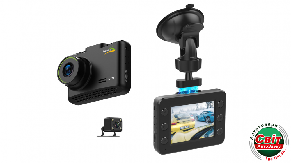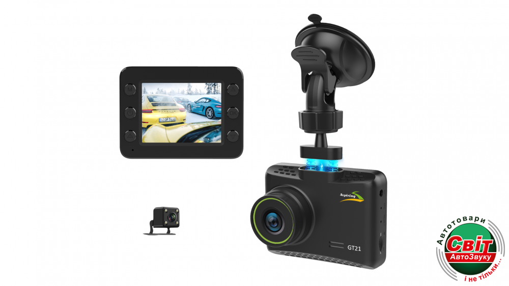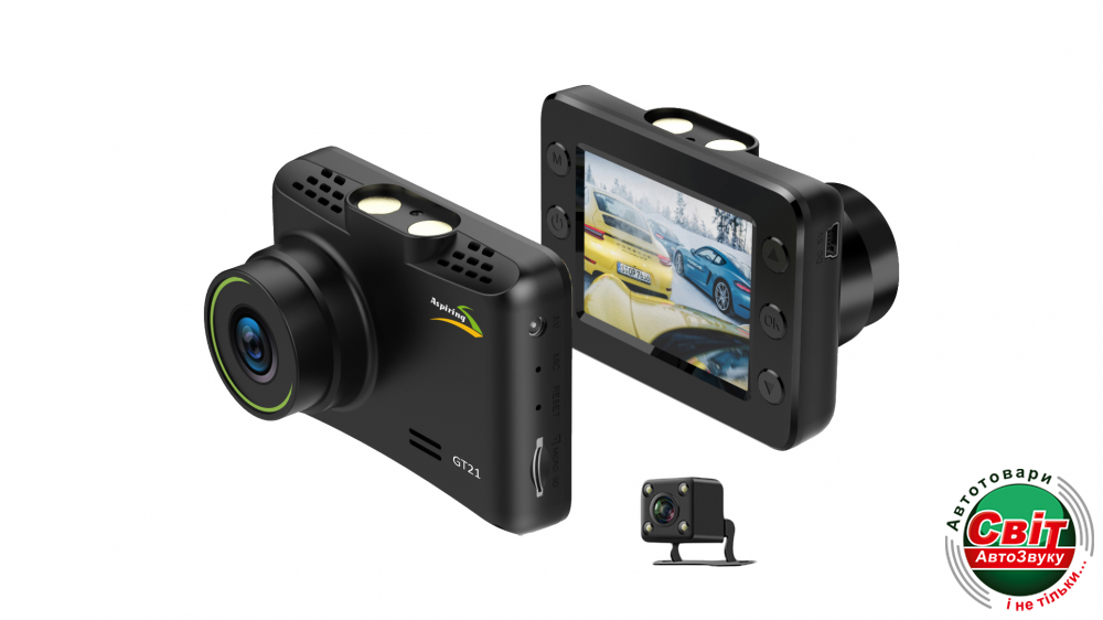 Відеореєстратор Aspiring GT21 Dual FHD (CD20HF7PR7)Aspiring GT21 DUAL FHD являє собою простий у використанні відеореєстратор з високою роздільною здатністю, оснащений дисплеєм 2,5". Завдяки широкому куту огляду в 170° забезпечується охоплення всієї дороги. Основною перевагою є його компактність і новітній процесор GP 6248. Ви можете бути повністю впевнені, що Aspiring GT21 DUAL FHD запише відео відмінної якості і за яскравого світла, і за низького рівня освітленості. Закріпіть камеру на лобовому склі та записуйте вашу поїздку з роздільною здатністю FullHD 1080p. Пристрій веде безперервний запис на карту пам'яті microSD (прилад приймає карти до 64 GB, купуються окремо, потрібен Сlass 10). Відзнятий відеоматеріал можна переглянути безпосередньо на дисплеї відеореєстратора або пізніше на комп'ютері.
