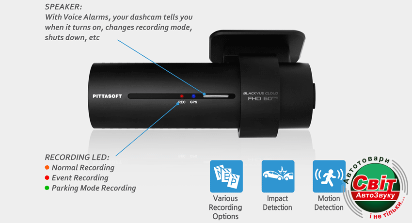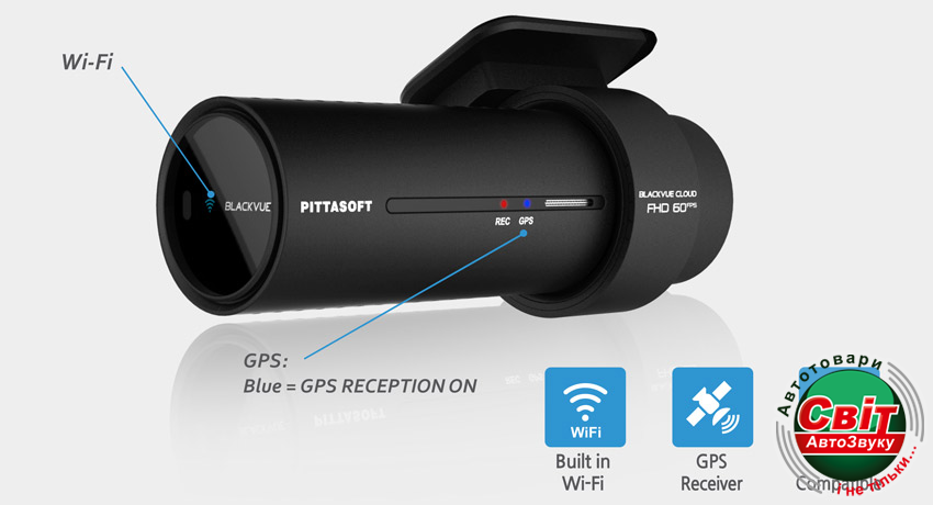 - через канал WI-FI за допомогою смартфона або планшета перегляд відеозапису і налаштування всіх параметрів відеореєстратора ( BlackVue APP )
