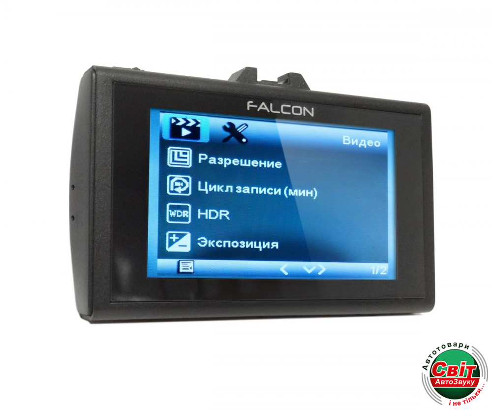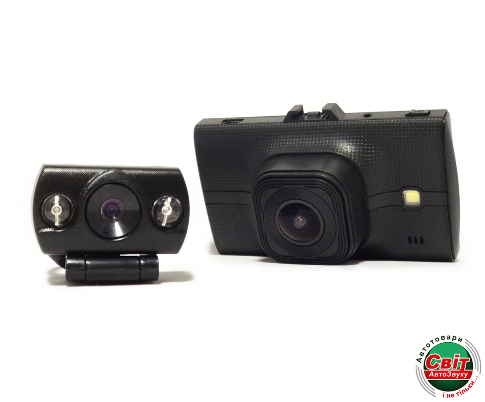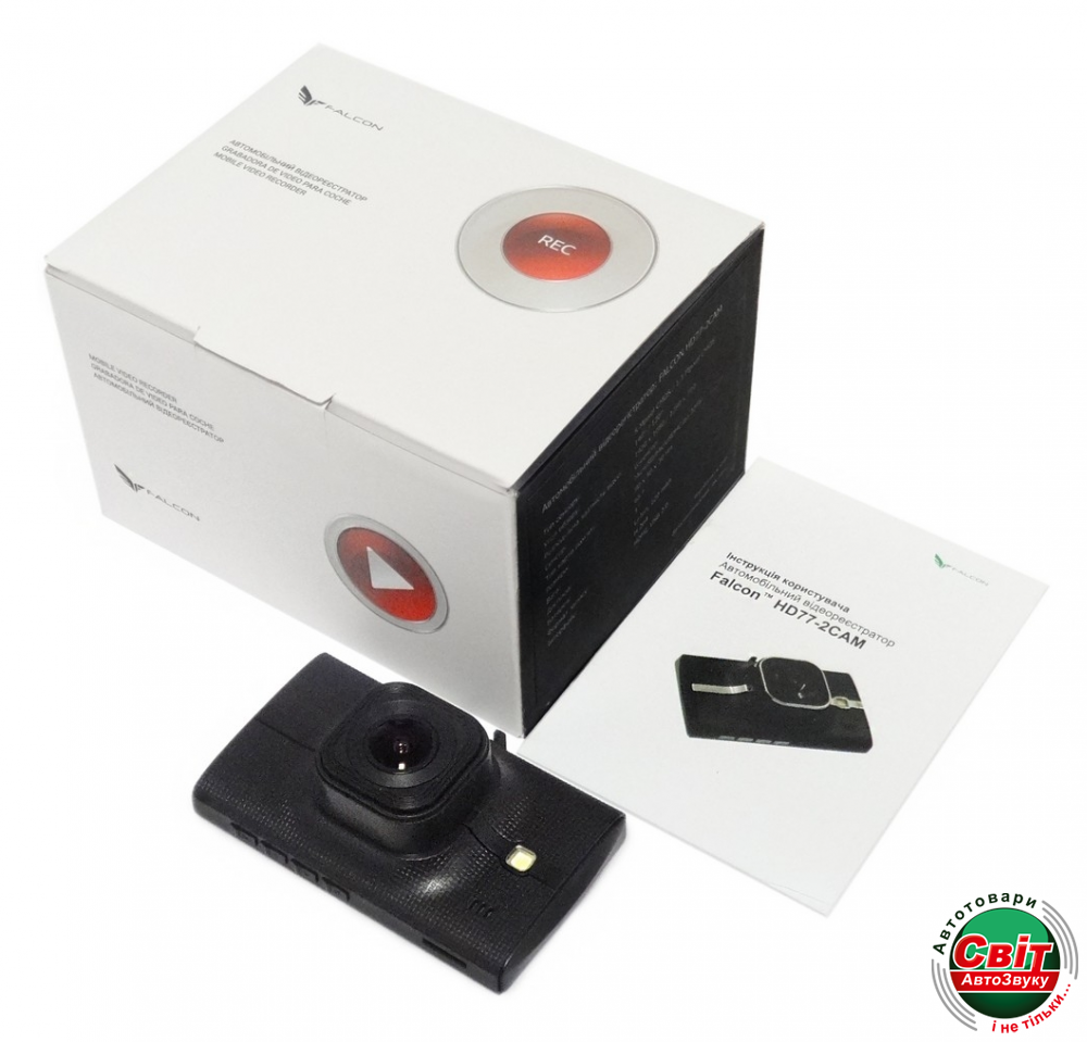 Falcon HD77-2CAM - двухкамерный (двухканальный) автомобильный видеорегистратор. Запись видео основной камеры в разрешении FullHD (1920x1080, 30 к/с), доп. камера HD (1280x720, 30 к/c). Процессор: Allwinner V3. Матрица 5Mp, CMOS. Угол обзора основной камеры 170°, дополнительной 120°. Формат видео MP4, кодек H.264. Формат видеозаписи MP4, видеокодек H.264. G-сенсор. Интерфейс miniUSB 2.0. Поддержка карт памяти до 32Mb. Встроенный дисплей 3.0''. Есть ИК-подсветка. Емкость АКБ 200 mAh.Функциональные особенности: