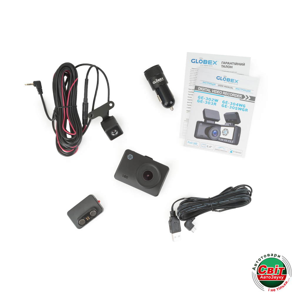 Вагомою перевагою GLOBEX GE-305WGR є наявність в комплекті додаткової камери заднього виду. Вона може фіксувати все, що відбувається позаду автомобіля при русі на дорозі або використовуватися, як система паркування при парковці автомобіля.