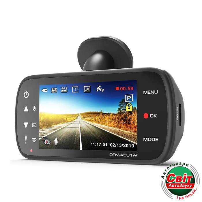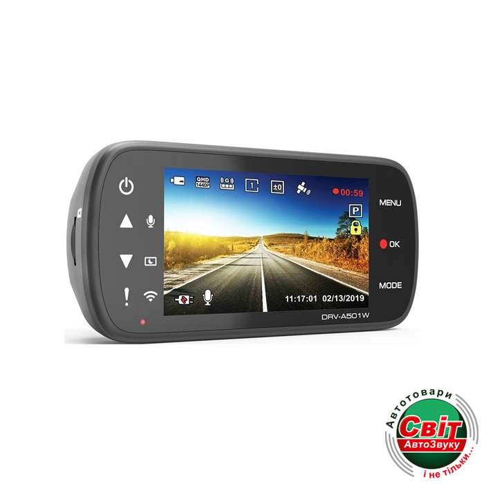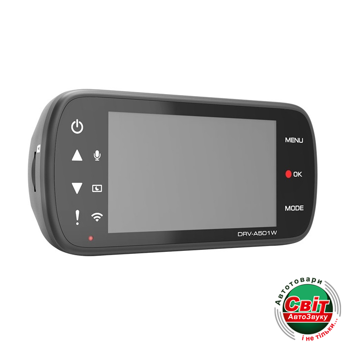 Відеореєстратор Kenwood DRV-A501WKenwood DRV-A501W універсальне записуючий пристрій з бездротовою мережею і GPS з нової лінійки відеореєстраторів. Модель обладнана повнокольоровим рідкокристалічним дисплеєм з діагоналлю 3 дюйми і Wide Quad HD (2560 x 1440) дозволом. Камера записує відео зі звуком у форматі MPEG-4 AVC. Відеокодек H. 264. У пристрої використовується CMOS матриця 1/2.8 з апертурою об'єктива F1.8. Кут огляду камери складає 126 градусів по діагоналі, 126 градусів по горизонталі, та 110 градусів по вертикалі. Відеореєстратор може робити знімки. Формат зображення JPEG.