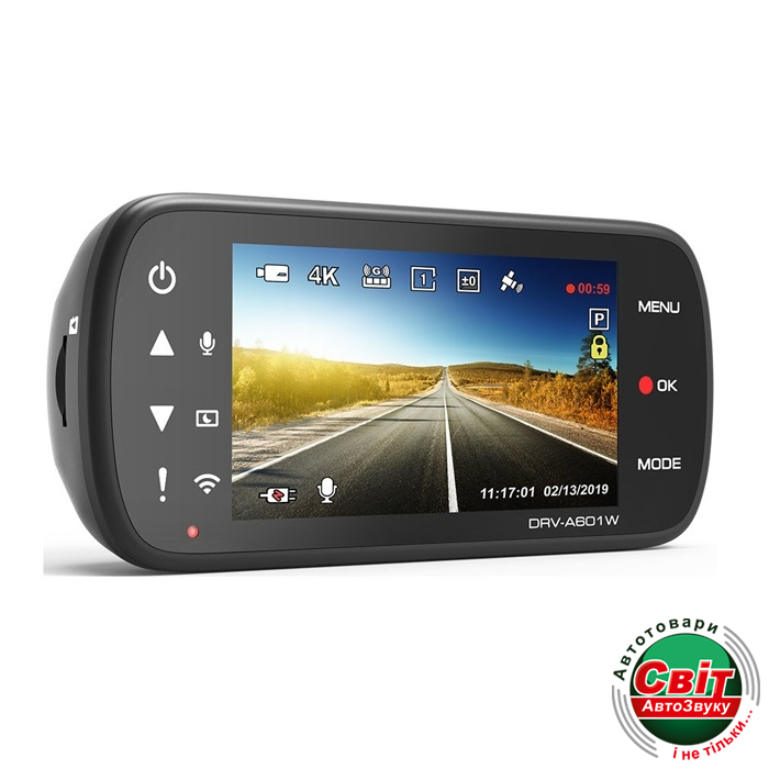 Відеореєстратор Kenwood DRV-A601WKenwood DRV-A601W універсальне записуючий пристрій з бездротовою мережею і GPS з нової лінійки відеореєстраторів. Модель обладнана повнокольоровим рідкокристалічним дисплеєм з діагоналлю 3 дюйми і 4K (3840 x 2160) дозволом. Камера записує відео зі звуком у форматі MPEG-4 AVC. Відеокодек H. 264.