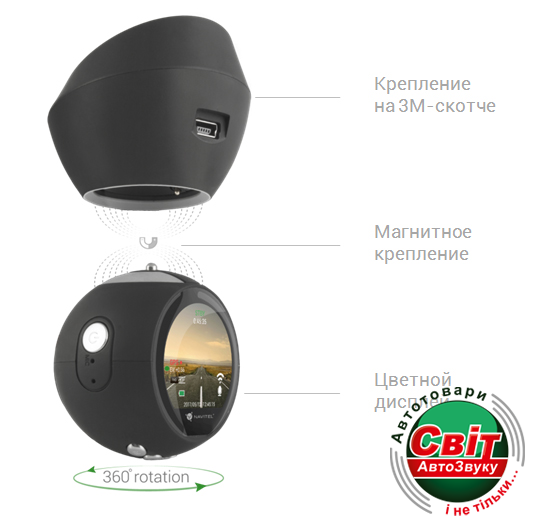 Камера регистратора Navitel R1000 соединена с кронштейном при помощи магнитного крепления. Это позволяет с легкостью поворачивать устройство на 360° для съемки внутри салона или сбоку от автомобиля. Кронштейн-держатель надежно крепится на лобовое стекло с помощью 3М-скотча, что обеспечивает жесткость конструкции и отсутствие вибрации.