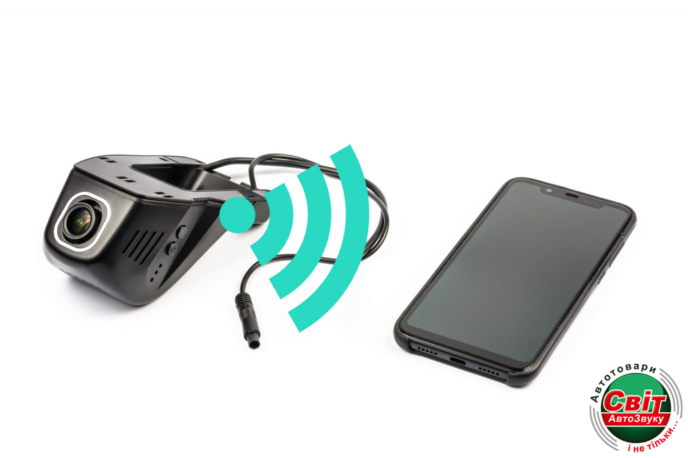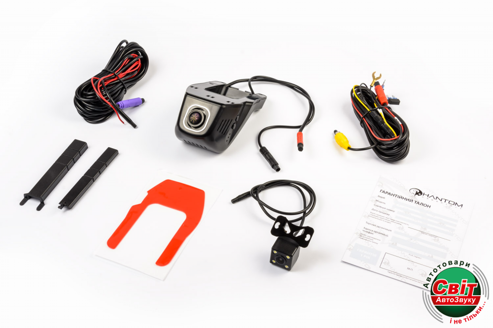 Відеореєстратор PHANTOM DVR-01FW не має власного екрану, але має RCA відео вихід і Wi-Fi для підключення до смартфонів на ОС Android і iOS.