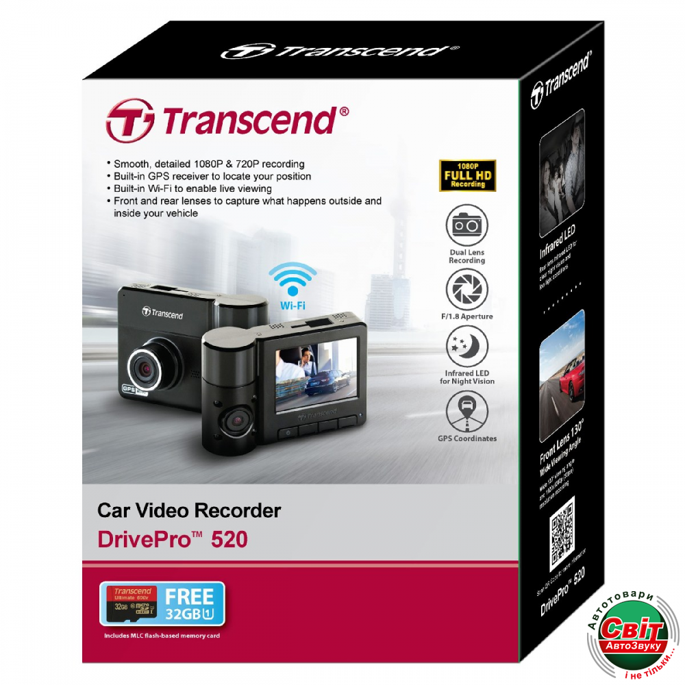 Відеореєстратор Transcend DrivePro 520Автомобильный видеорегистратор DrivePro 520 адресован тем, кто серьезно подходит к вопросам личной безопасности в дороге: устройство оснащено двумя объективами. Фронтальный объектив состоит из 6 линз, отличается широким углом обзора (130°), имеет большую диафрагму ƒ/1.8 и позволяет с кристальной четкостью фиксировать все дорожные события, записывая видео в формате Full HD 1080P с частотой 30 кадров/сек. Поворотный задний объектив (180°) оснащен четырьмя инфракрасными светодиодами, которые помогают вести съемку в салоне автомобиля в условиях низкого уровня освещенности или ночью. DrivePro 520 прост в установке и использовании и содержит встроенный адаптер Wi-Fi, позволяющий транслировать, загружать и передавать видео на мобильные устройства.