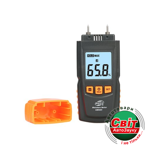 Вологомір деревини Benetech GM605Вологомір GM605 для деревини та будівельних матеріалів від компанії Benetech. Основним призначенням даної моделі є вимірювання вологості деревини, виробів з деревини та будівельних матеріалів, таких як цегла, гіпс, цементний і вапняний розчин. В основі роботи вологоміра GM605 покладено принцип електропровідності матеріалу. Цей метод вимірювання називається кондуктометрическим. Перевагою даної моделі перед багатьма іншими вологомірами дерева є можливість вибору породи деревини (4 режиму для 28 порід). Це дуже важливо так як електропровідність матеріалу безпосередньо залежить від його щільності. Якщо вологомір не оснащений такою функцією, то скоріше всього отримані результати вимірювань виявляться невірними так як не враховується один із найголовніших параметрів щільність. Купуючи ж вологомір GM605 ви отримуєте за відносно низьку ціну вельми точний вологомір. Наступним важливим перевагою даної моделі є змінні голки. Це дуже важливо так як дана частина будь-якого контактного вологоміра відчуває під час вимірювань велике навантаження і швидко виходить з ладу.