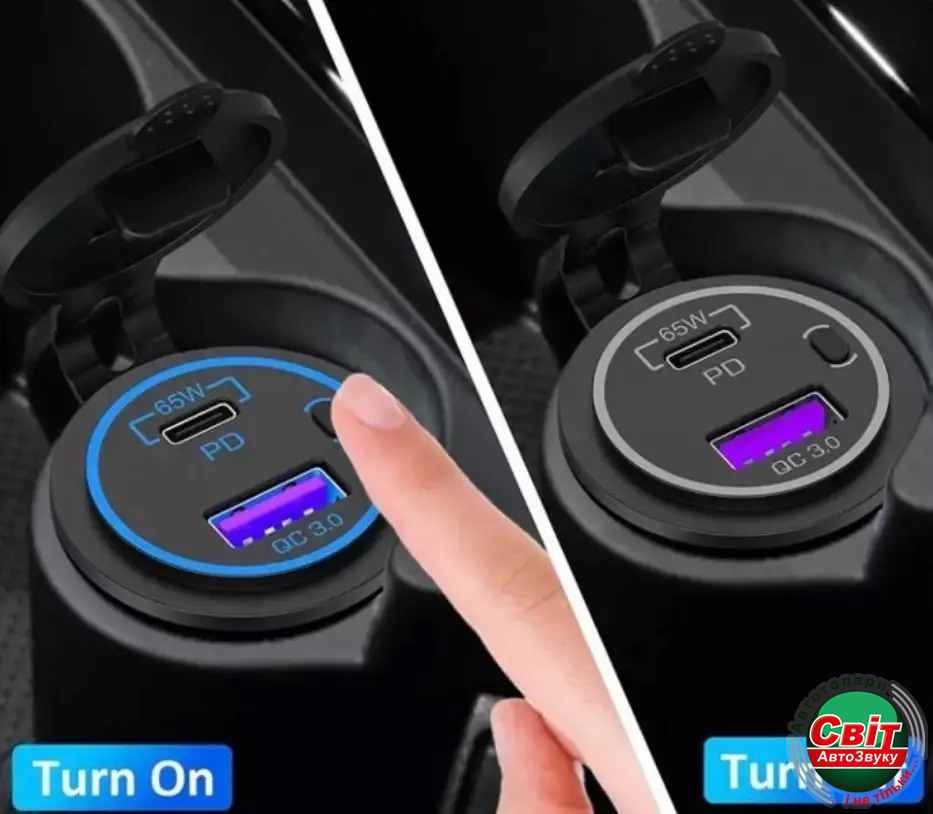 Адаптер врізний USB зарядка QC 3.0+PD Type-C 65W з кнопкою в прикурювачАдаптер оснащений гумовою заглушкою для запобігання потрапляння пилу і вологи в пристрій, розетка має підсвічування.