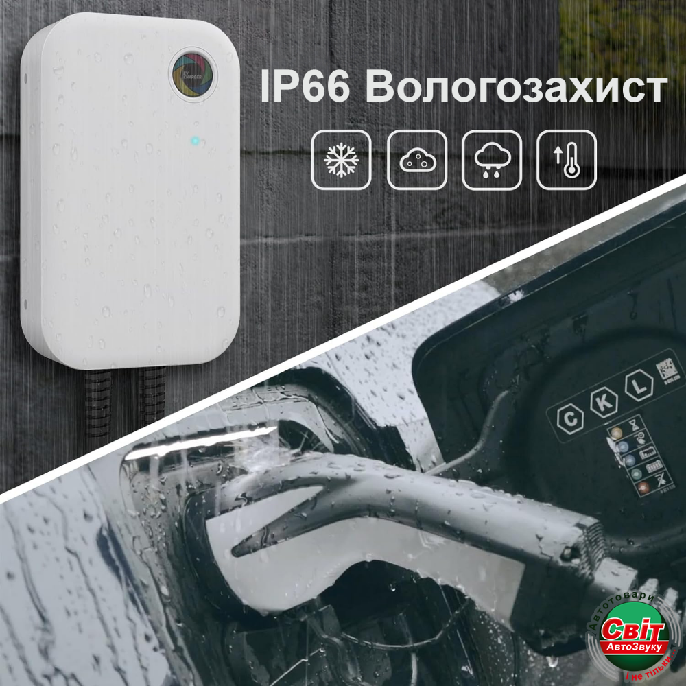Універсальний та сумісний з усіма європейськими електричними та гібридними автомобілями на ринку. Високий клас захисту від води та пилу за стандартом IP66 робить цей пристрій придатним для експлуатації як у приміщенні, так і на вулиці за будь-яких погодних умов. Сенсорний РК-екран дозволяє легко відстежувати статус заряджання та настроювати параметри заряджання, надаючи користувачам детальну інформацію про процес заряджання в реальному часі. Елегантний дизайн корпусу з білим покриттям є стійким до ударів, що робить його стильним і практичним. Комплекс захисних функцій, до якого входить вбудований ПЗВ типу А 6 мА, є критично важливим для запобігання можливому електричному ураженню або пошкодженню електроустаткування. Крім того, він обладнаний додатковими захисними функціями такими як: захист від перенапруг, недонапруг, перевантаження, короткого замикання, витоку струму та перегріву, забезпечуючи повну впевненість у безпеці та довготривалому використанні. Потужний та довговічний кабель з термопластичного поліуретану (ТПУ) довжиною 6.1 метра відповідає європейським стандартам безпеки, не містить галогенів та стійкий до екстремальних температур, як високих, так і низьких. Конектор оснащений захисною гумовою кришкою, яка ефективно захищає від вологи та бруду. Він також має посилений кожух кріплення кабелю, що забезпечує додаткову міцність та довговічність кабельного з'єднання, а срібні мідні контакти оснащені системою автоматичного очищення.