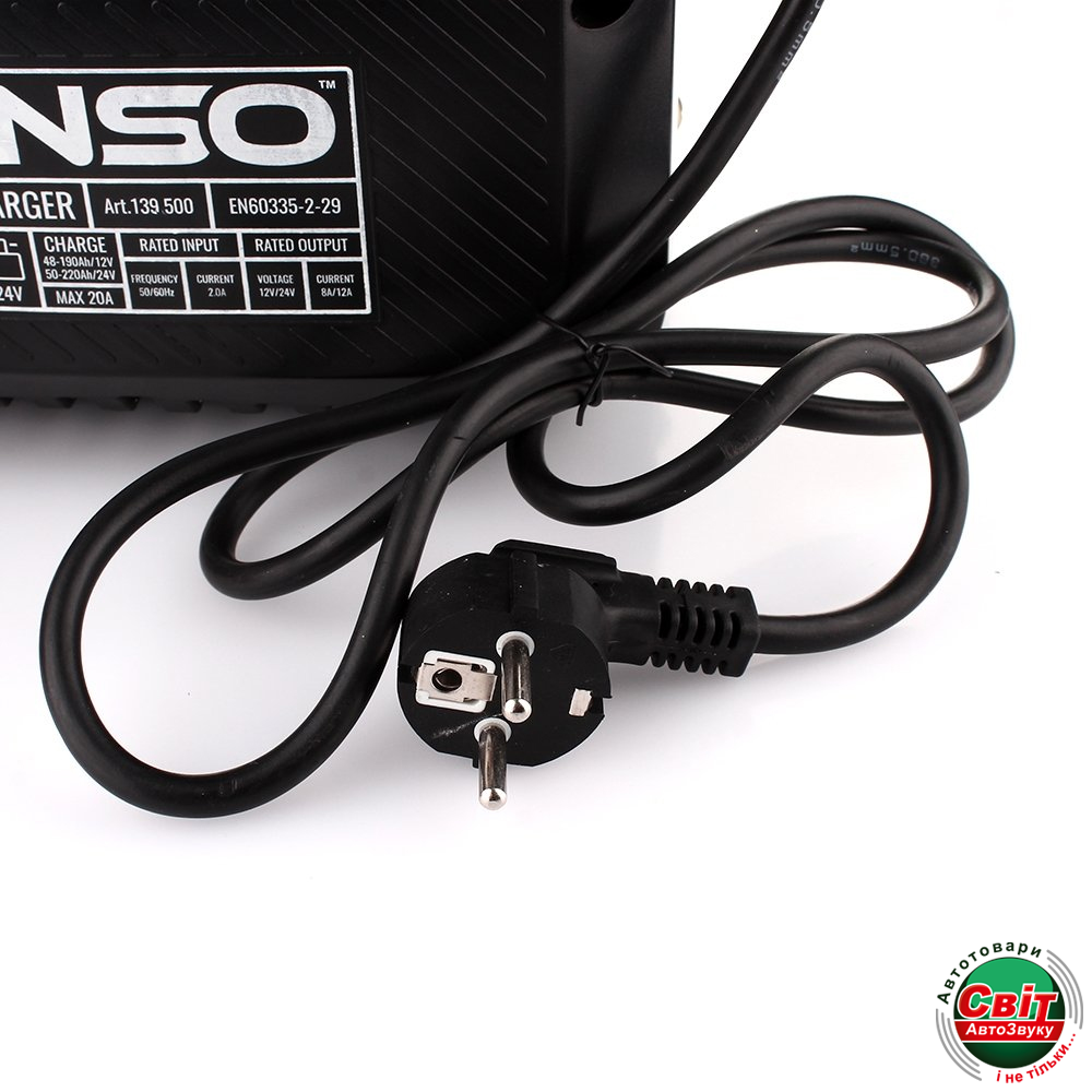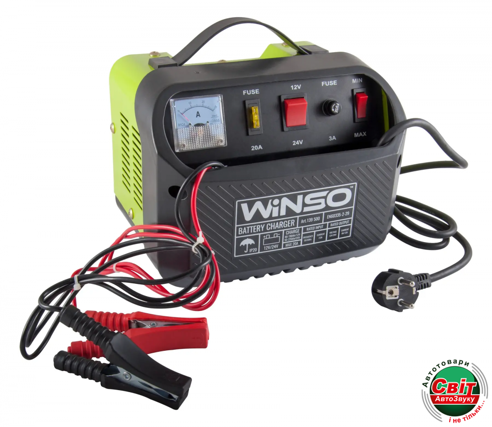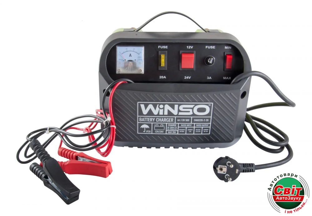 Зарядний пристрій оснащений системою захисту від короткого замикання, захистом від перезаряджання та функцією безперервного підзаряджання. Під'єднують до мережі з напругою 220 В. Winso 139500 з клемами акумулятора з'єднують роз'ємами-крокодилами.