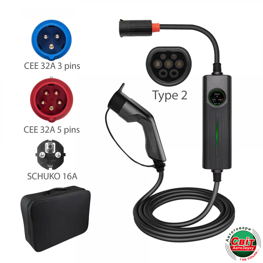 Універсальність підключення: пристрій має роз'єм Type 2, який є стандартним для всіх європейських електромобілів. Крім того, в комплекті є три перехідники для будь-яких сценаріїв підключення до електромережі: