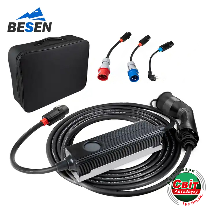 Зарядний пристрій Besen 16 кВт Type 2 з екраном 6,7 м. IP66 (BS-PCD050 Type 2)Зарядний пристрій Besen з екраном Type 2 16 кВт 230/400В 6,7 м. IP66 (BS-PCD050 Type 2) дає можливість заряджати ваше авто скрізь, де є доступне джерело змінного струму. Завдяки адаптерам, що входять до комплекту, можна використовувати пристрій вдома, у відпустці та поїздках. А зручний кейс дозволить зручно возити зарядний пристрій у багажнику.