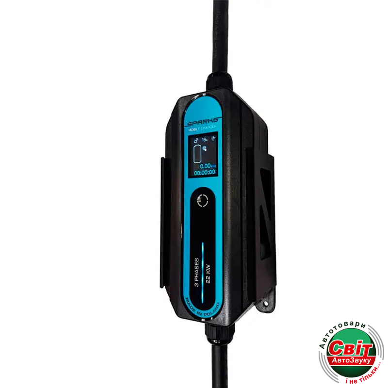 Портативний зарядний пристрій Sparks Mobile charger для прискореної зарядки електромобілів з роз'ємом Type 2 (Mennekes). Цей тип роз'єму зустрічається в автомобілях з європейського ринку. Роз'єм стандарту Type 2 (Mennekes) є трифазним, але деякі європейські автомобілі використовують тільки одну фазу.