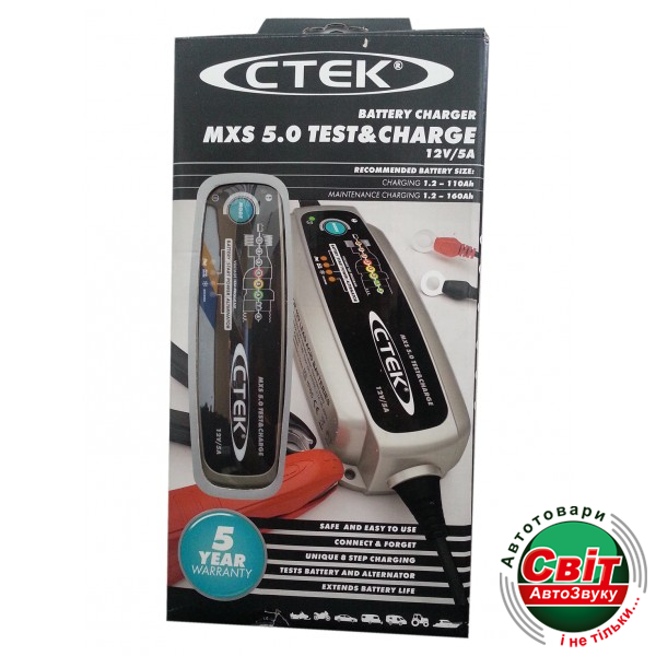 CTEK MXS 5.0 TEST & CHARGE поєднує в собі покращений зарядний пристрій на мікропроцесорному управлінні з батареєю та функцію тестування генератора, що забезпечує чудове тестування, зарядку та профілактику акумуляторних батарей.