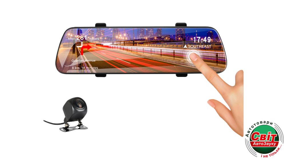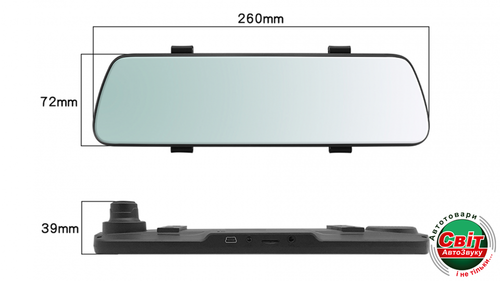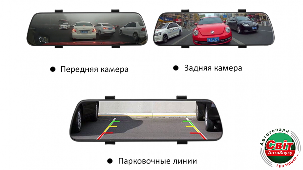 Дисплей на всі дзеркало заднього виду 9.66 дюймів. В комплектації є універсальні кріплення, які допоможуть встановити реєстратор на будь-який штатний автомобільне дзеркало заднього виду.