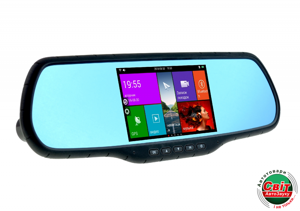 Дзеркало з відеореєстратором Cyclone MR-110 AND v2Мультимедийное Зеркало заднего вида с видеорегистратором, WIFI, Bluetooth, GPS и камерой заднего вида, встроенный сенсорный дисплей 5 дюймов. Устройство работает на базе системы Android 4,4. В выключенном состоянии это обычное зеркало заднего вида, но стоит только включить зеркало , как перед Вами сразу же открывается современный девайс на базе системы Android. Зеркало MR-110 Android оборудовано видеорегистратором с качеством записи FullHD (1920x1080 пикселей), записью одновременно с 2-х камер, ( возможность использования выносной камеры в режиме парковки), GPS модулем с выносной антенной, присутствует и ФМ трансмиттер (для передачи аудио на штатную магнитолу)