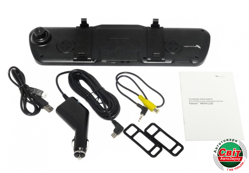 Дзеркало з відеореєстратором Falcon HD60-LCDFALCON HD60-LCD легко крепится на зеркало заднего вида и выполняет функции зеркала и видеорегистратора 2 в 1. FALCON HD60-LCD записывает видео в Full HD и обеспечивает высокую четкость картинки. FALCON HD60-LCD cпособен отобразить большее количество деталей даже в условиях низкой освещенности. При этом у Falcon HD60-LCD есть экран 4,3’’ для просмотра всего записанного видео без необходимости подключения дополнительного кабеля, а так же для сигнала подключеной камеры заднего вида.